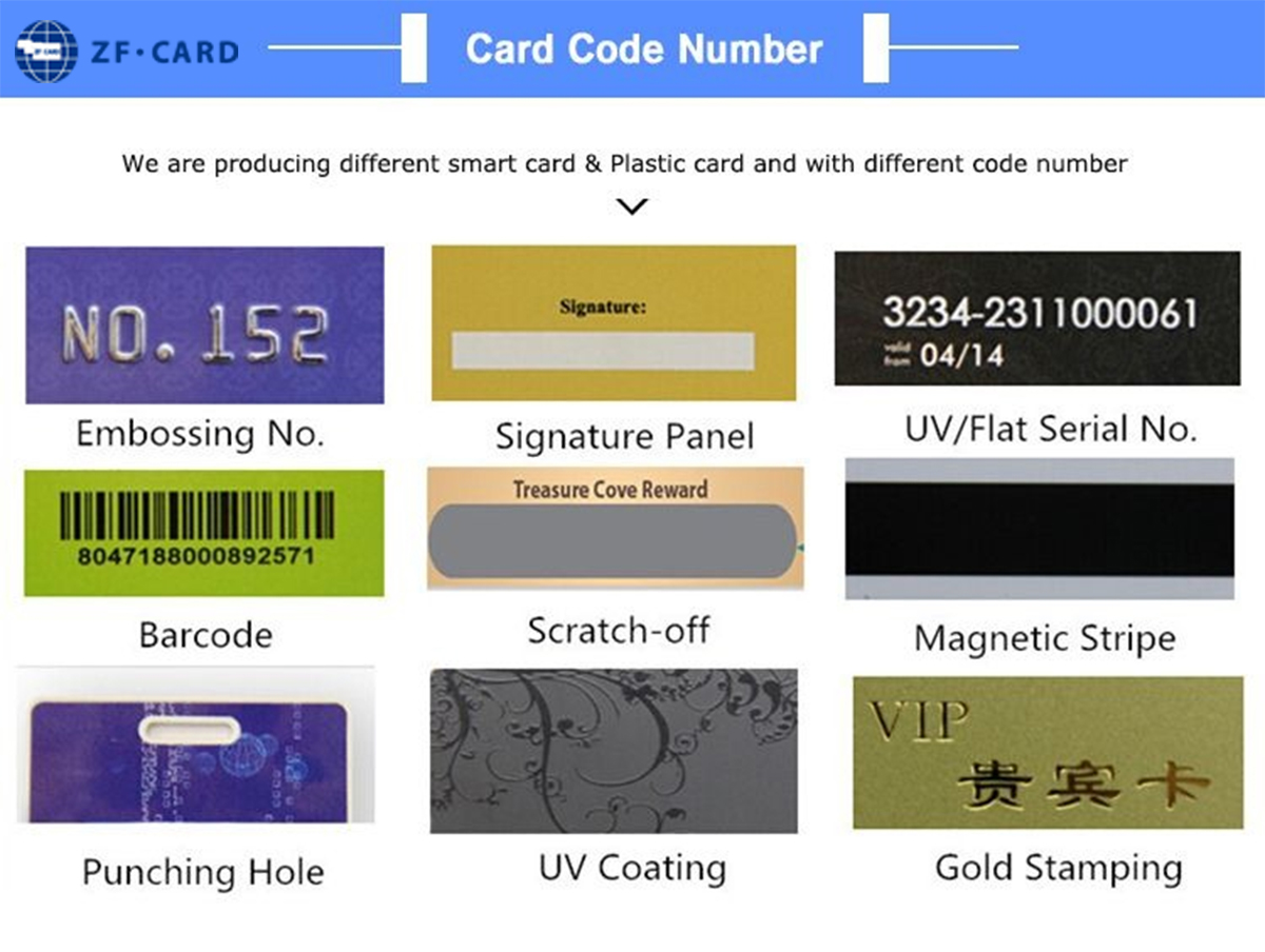 6. Card code number processing: We could provide you with many kinds of card code number printing, such as Embossing number, signature panel, UV/Flat serial number, barcode, scratch-off, magnetic stripe, punching hole, UV coating, gold stamping and so on. If you are interested in it, you could ask us for free samples.